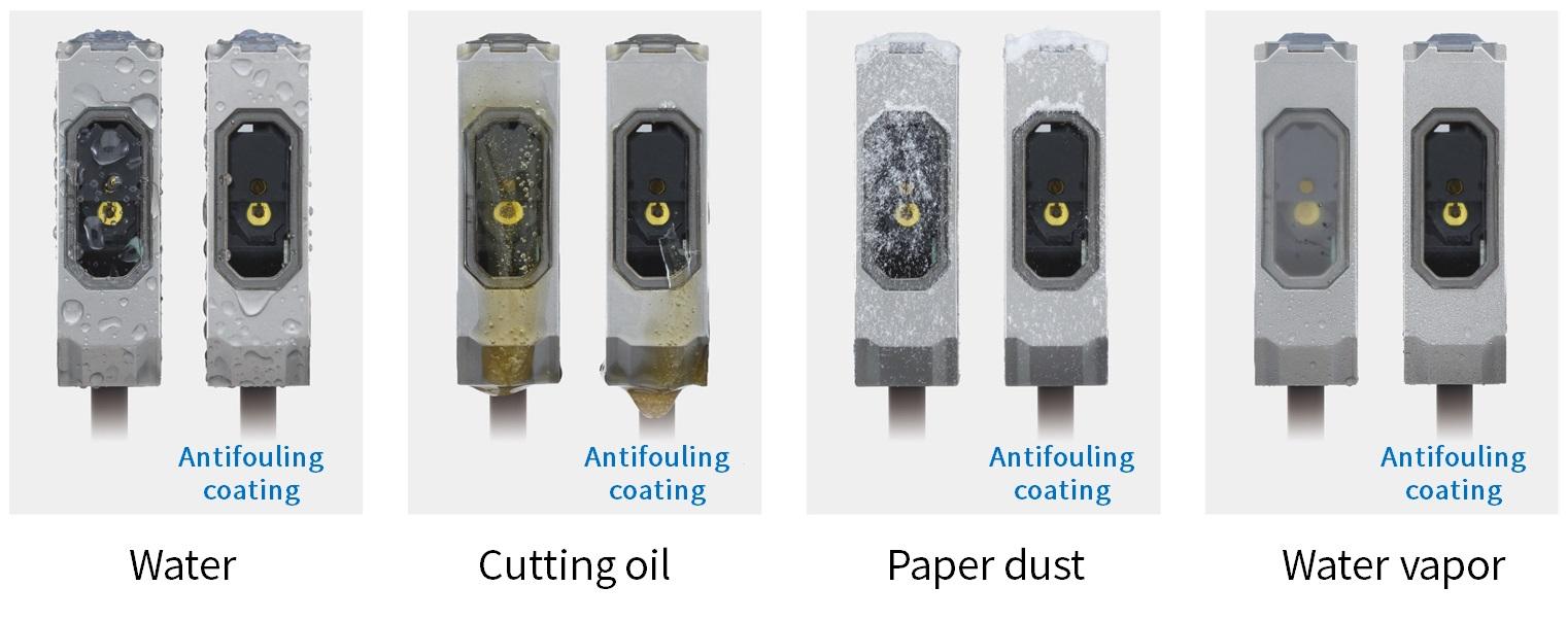 Dirty sensing surfaces can cause false detection due to the principle of photoelectric sensors. Therefore, unexpected recovery work after line stoppages and periodic cleaning were required to prevent lines from stopping. The E3AS Series with the antifouling coating on the sensing surface prevents water droplets, oil, and dust from sticking to the sensing surface, and keeps the lens from fogging as well. Therefore, the coating prevents contamination on the sensing surface in environments where oil or dust scatters, or steam generates, reducing false detection and cleaning frequency.